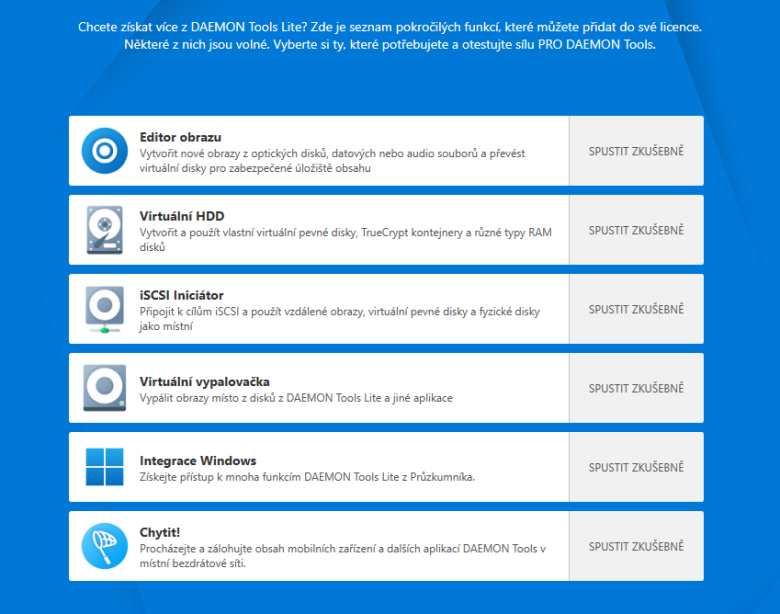 A zde ještě pokročilé funkce Daemon Tools, které můžete aktivovat zakoupením, pokud vám to samozřejmě za to stojí, tuto nabídku zvažte.