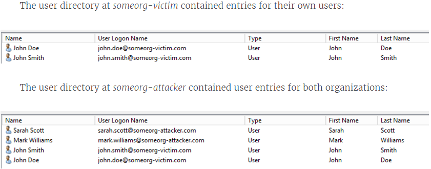 K provedení útoku a získání přístupu k datům z vybrané společnosti stačilo, aby si útočník pořídil předplatné Office 365, klidně ve verzi trial a zprovoznil SAML autentizaci. Následně do databáze svých uživatelů přidal jméno a email uživatele z cílové společnosti. Poté už jen stačilo navštívit portál Office 365, identifikovat se jako uživatel ze společnosti útočníka a tím získat ověření k databázi útočníka. Při následném přihlášení s emailovou adresou oběti byl útočník vpuštěn k cizím datům.