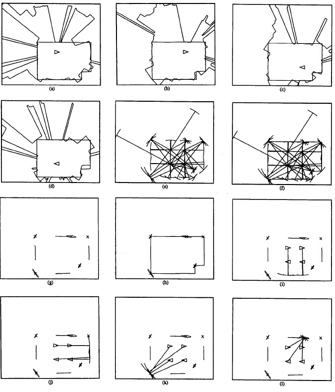 Mapa prostředí, kterou si robotí vozítko dokázalo zapamatovat, vypadala přibližně jako na následujícím obrázku. Obdélník reprezentuje malou místnost, trojúhelník autonomní vozítko a nepravidelné paprsky pak měření sonaru. Je nutné upozornit, že takovéto z dnešního pohledu směšné výsledky byly k dispozici až v roce 1991(!!!). Výsledkem práce řídícího algoritmu bylo tedy několik detekovaných stěn a bodů – viz. obrázek (l) vpravo dole.